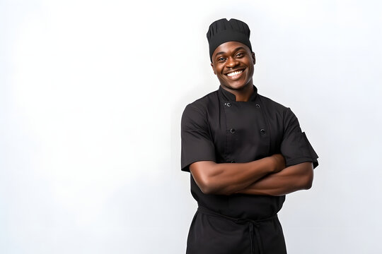 smiling black African-American chef in a black uniform with crossed arms, on a white background