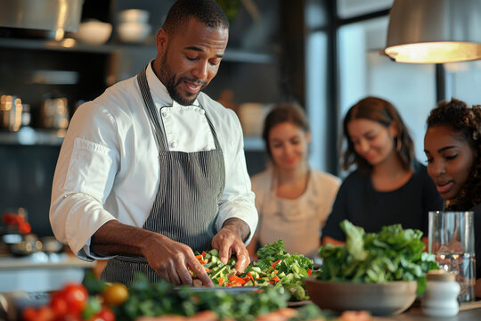 mãos de uma cozinheira usando Dolmã, preparando e picando alho e cebola sobre uma tabua de madeira e mais pote branco com salsa e cebolinha picados.