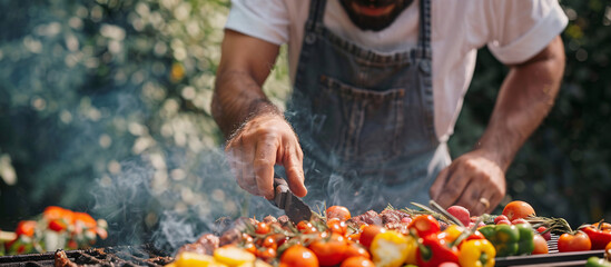 BBQ chef. Man grilling meat at barbecue at outdoor event. Man looking successful, positive and proud. Asian male happy cook in white hat preparing food meat, making grill at culinary celebration