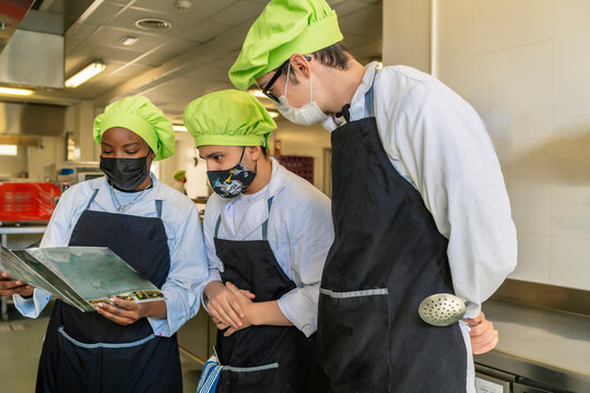 Head chef with modern laptop showing to sous chef recipe for gourmet dish required for gastronomic event held at restaurant. Food industry workers standing in professional kitchen while using computer
