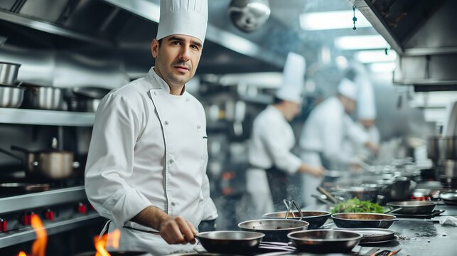 Chef cooking in busy restaurant kitchen