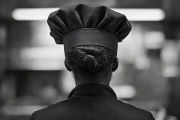 Chef de espaldas en un entorno culinario, listo para crear una obra maestra detrás de la cocina.