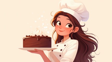 A delightful baker dressed in her professional uniform and chef hat proudly presents a decadent chocolate cake on a plate This cheerful scene is brought to life through a charming cartoon ch