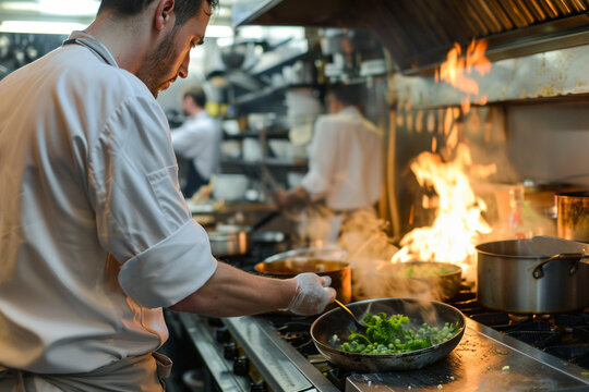 Chef Cooking with Flames in Restaurant Kitchen
