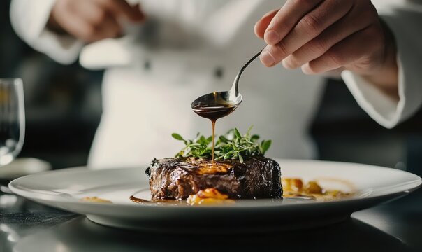 Five star chef dressing an elegant dish at Michelin star restaurant, シェフ steak