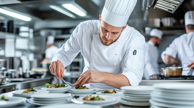 Professional chefs working in a busy commercial kitchen, cooking, preparing and plating dishes with precision and teamwork.