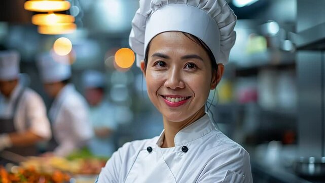 Smiling female chef in a restaurant showcasing culinary expertise and professionalism during a busy dining service