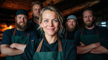 A dedicated team of chefs, led by a female chef, proudly poses in a rustic kitchen, signifying teamwork, passion, and the joy of cooking in a warm, inviting atmosphere.