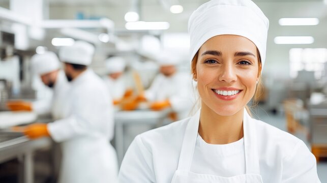 Smiling chef in a modern kitchen, showcasing culinary passion and teamwork among professionals in a vibrant culinary environment.