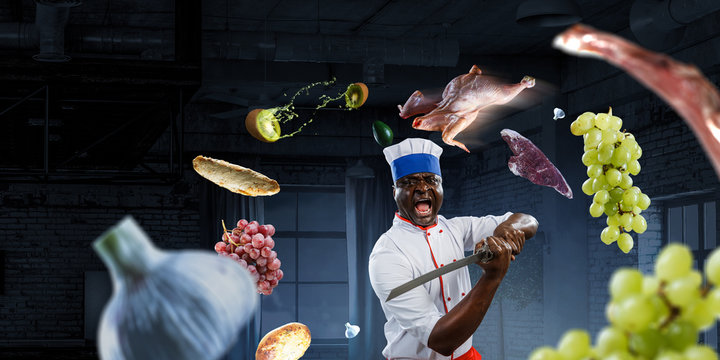 A skilled chef is passionately preparing a gourmet dish within a stylish, modern kitchen space