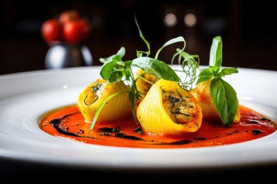 A beautifully arranged plate showcases stuffed tomatoes topped with breadcrumbs, surrounded by colorful garnishes like cherry tomatoes and herbs, highlighting culinary artistry