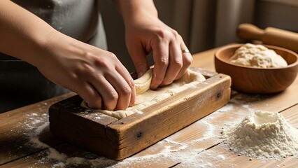 Hands shaping artisan dough in rustic mold on wooden surface scene