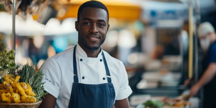 Confident chef in professional kitchen for hiring announcement