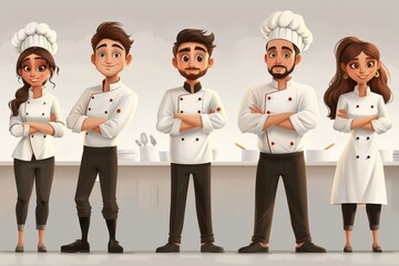 An illustrated group of animated chefs in a kitchen, each with various expressions and postures, showcasing teamwork, culinary skills, and a lively kitchen environment.