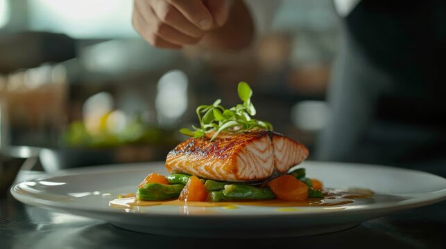 Gourmet chefs plate pan-seared salmon with fresh vegetables and sauces in fine-dining kitchens, highlighting healthy eating and culinary expertise