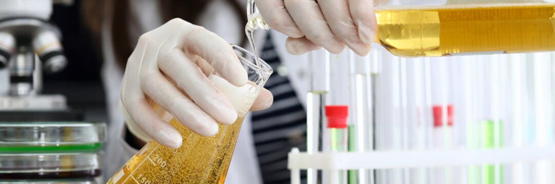 Close-up of hands of assistant pouring yellow liquid into flask. Experienced researcher mixing aqua with test tube in laboratory. Chemical experiments concept