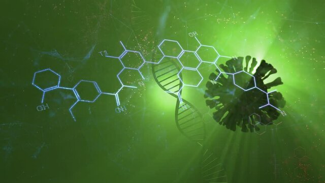 Corona virus with dna structure and chemical bonds animation. Green volumetric light motion background.