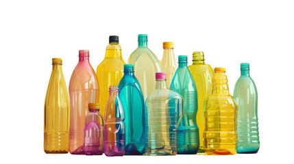 A group of colorful, empty plastic bottles of various shapes and sizes arranged in a pyramid formation against a clean. Isolated on white background.