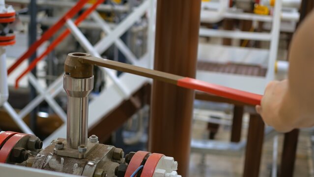 In chemical plant, worker is opening valve to resume flow of chemicals necessary for fertilizer production. operations after scheduled maintenance, production of essential agricultural products.