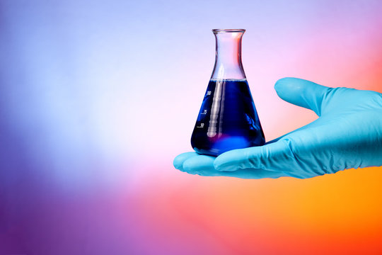 A scientist's hand in a chemical lab holding a flask filled with lab glassware against a backdrop of science lab apparatus