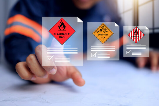 Flammable gas and hazardous substance concept with safety staff pointing on document detail for dangerous goods reports while declare category in shipping cargo and storage area