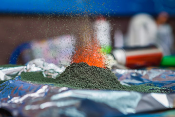 Colorful chemical reaction in a laboratory flask, emitting glowing sparks, demonstrating scientific exploration.