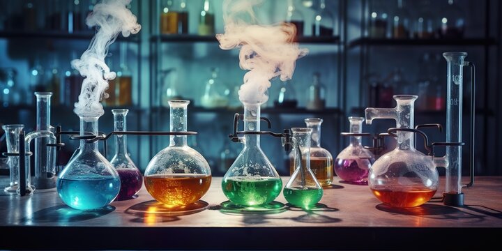 Photo of a chemistry lab with flasks filled with colorful liquids, bubbling over a Bunsen burner