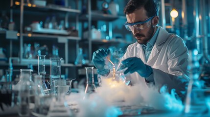 Chemist in a lab coat performing a chemical reaction experiment, with various glassware and reagents on the lab bench.