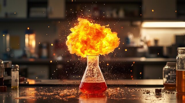 Explosive chemical reaction in a flask.  Fiery explosion in a lab setting