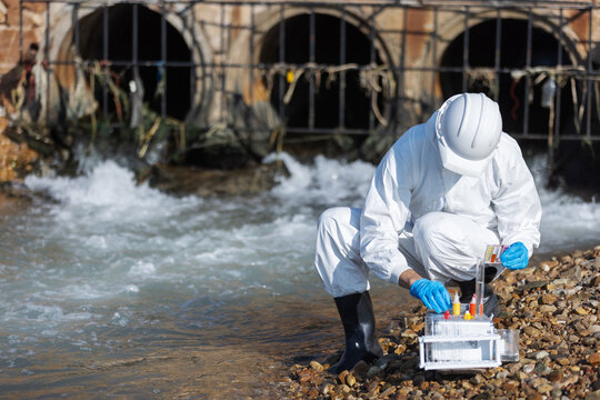 A scientist in full protective gear collects water samples from a drainage area for chemical testing. The scene highlights environmental inspection and pollution monitoring near industrial discharge.