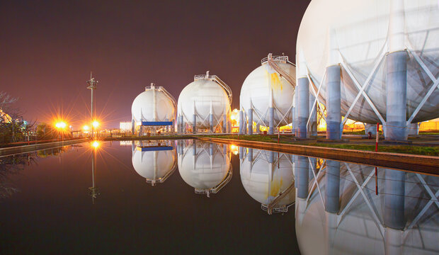 Natural gas tank at night - LNG or liquefied natural Industrial Spherical gas storage tank