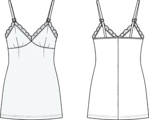 Elegant Lace Trim Lingerie Nightwear Slip Dress Technical Fashion Flat Sketch CAD Drawing for Apparel Template Design with Adjustable Straps.