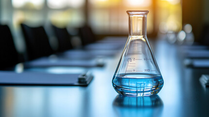 Science laboratory glass flask symbolizing innovation and research placed on a table in a business meeting room, with a blurred background of a conference hall and sunlight streaming in.