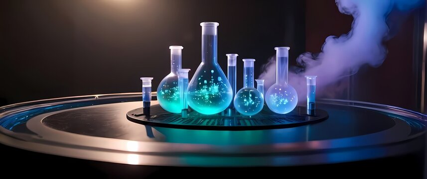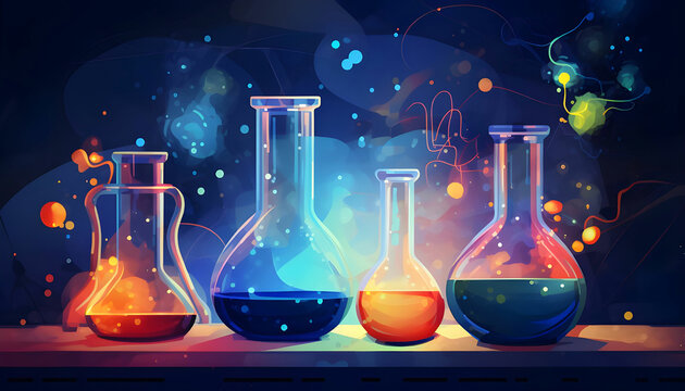 Graphic illustration for chemistry lab and experiments with beakers and flasks