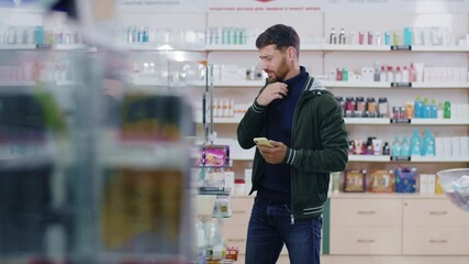 Sick caucasian patient visiting doctor consultant in drugstore. Young professional woman searching medications for flu symptoms. Healthcare. Buying medicine.