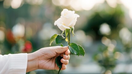 Close-up of a hand holding a white rose at a memorial site, symbolizing the reflection on cherished memories and the honoring of loved ones