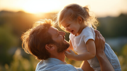 Daughter laughing while father lifts, golden warm sunshine bathing, pure family joy capture, precious symbol moment, playful parent-child interaction, defocused outdoor background,