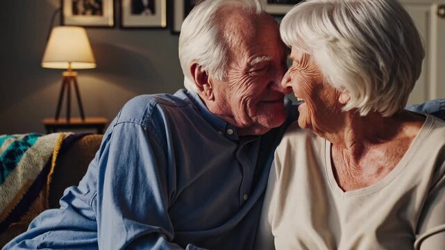 Elderly couple sharing a tender moment at home in a cozy living room during the evening
