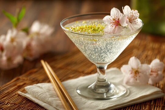 Refreshing sparkling drink with cherry blossoms in a martini glass on a bamboo mat.