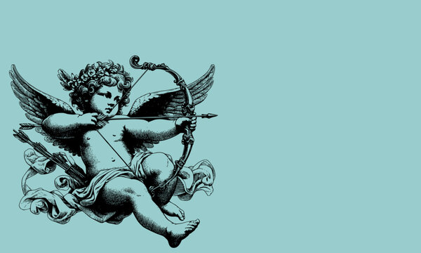 Cute Cupid with love arrow and stars. Beautiful Amur in engraving style. God of love and romance. Mythological antique character on a light background.