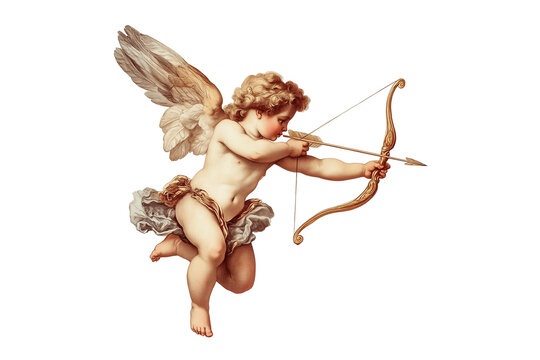 Vintage style cupid or cherub shooting an arrow with a bow, love angel, Valentine's day or wedding illustration isolated on transparent or white background, png file