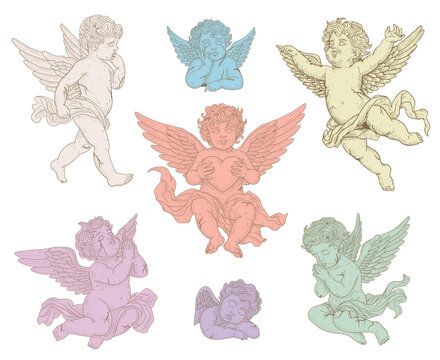Cherub Cupid Love Angel Vintage Vector Set Valentine’s Day Celebration Engraving Print For Cards, Invitations, Tattoo, Clothing Design