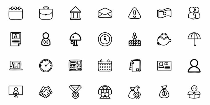 A collection of business and finance themed outline icons arranged in a grid pattern on a white background