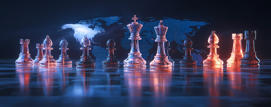 In a dark blue atmosphere, a chessboard with chess pieces, and the world map in the background. Symbolizing strategic conflicts and the threat of war hanging over the planet.