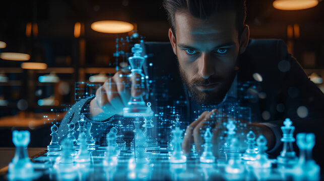 Business Strategy concept. A thoughtful business looking at chess pieces on a board. Thinking about business plan