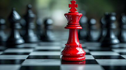 A red king chess piece on a checkered board with black pieces.