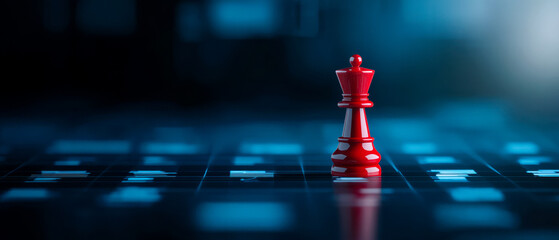 A close-up of a red chess king piece set against a dark, illuminated chessboard, symbolizing strategy and competition in a game of chess.