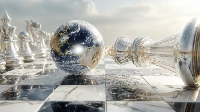 Fiery and icy themed chess pieces clashing on a glossy board under controlled studio lighting, with sharp textures and cinematic contrast at the center point