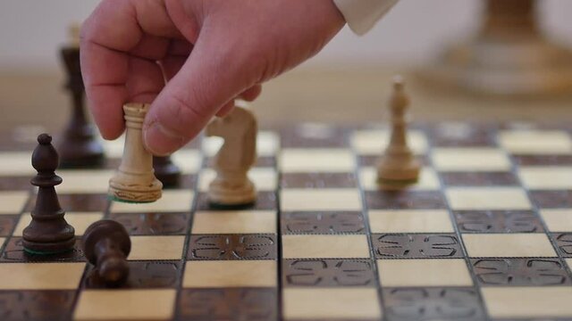 slow motion view of white rook knocking off black pawn. Business man moving chess figure with team behind - strategy, management or leadership concept. challenges planning business strategy to success