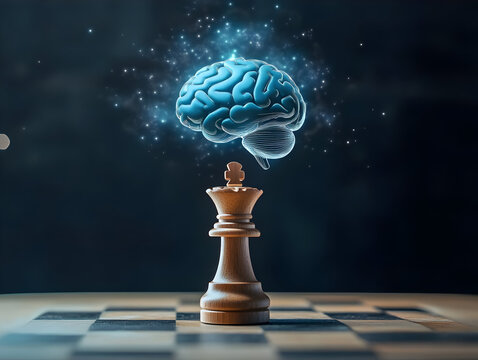 A creative concept depicting a brain above a chess piece, symbolizing intelligence and strategic thinking.